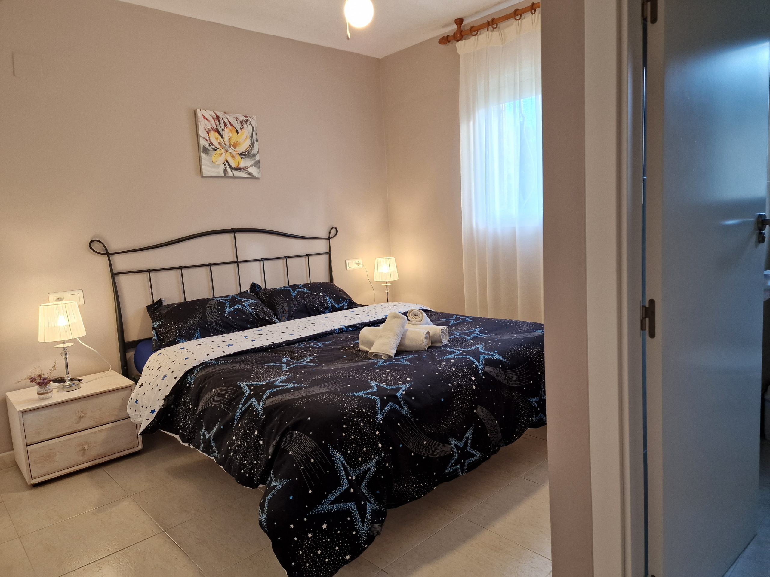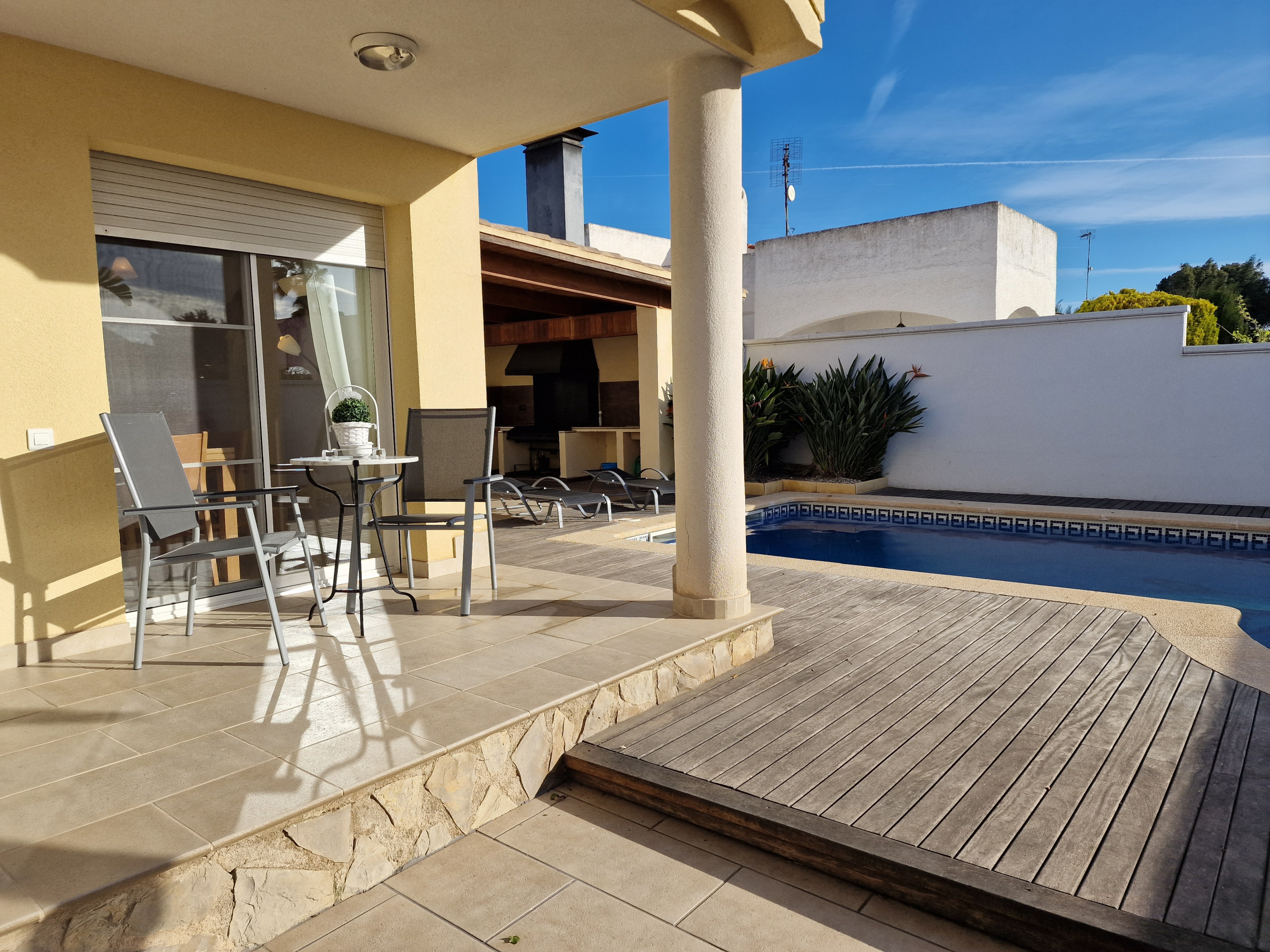 Elle dispose de jardin, mobilier de jardin, clôture, terrasse, lave-linge, barbecue, climatisation, piscine privée, garage même bâtiment, TV, tv satellite.